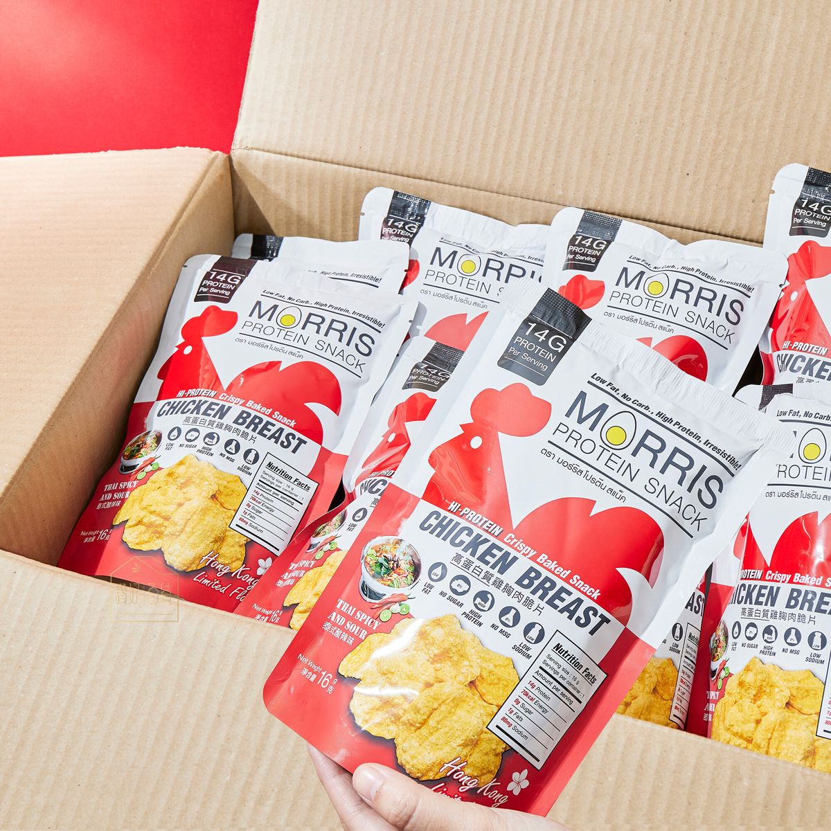 MORRIS - 原箱優惠 - 高蛋白質雞胸肉脆片 泰式酸辣味20包裝 - 無麩質 適合生酮/低醣/健身/高蛋白質/低卡路里低脂肪飲食#即食雞胸肉薯片零食