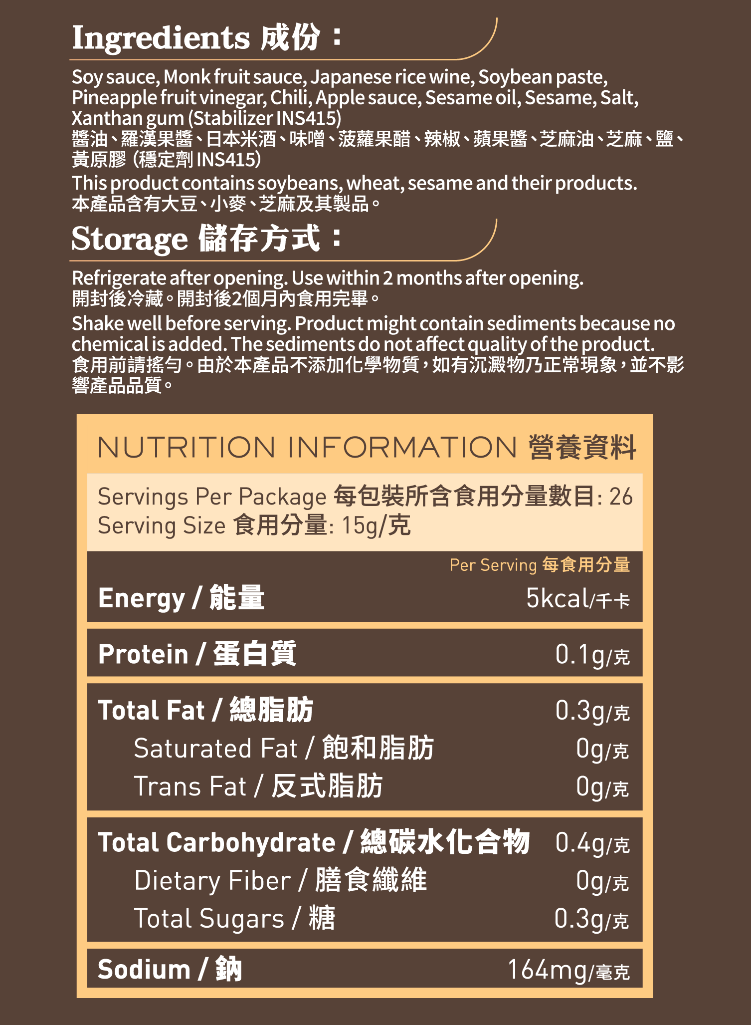 低醣日式燒肉汁以「甘口」風味呈現,選用天然植物性原料調製,完全不添加糖分、防腐劑、人造色素與味精,特別適合控糖、控卡、低醣飲食者日常食用。